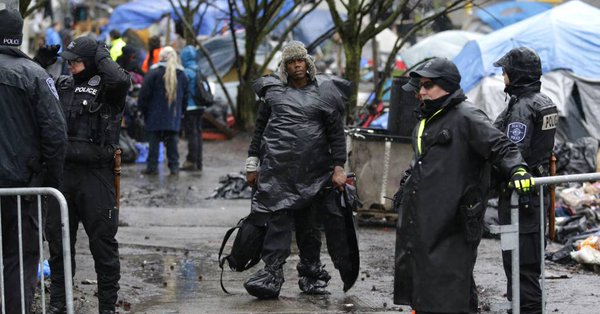 In this March 7, 2017 photo, a man wearing plastic bags in the rain carries belongings as he walks during a sweep to clear out people living at a homeless encampment known as "The Field," in Seattle's Stadium district south of downtown. Sixteen months after he declared a state of emergency on homelessness, Seattle’s mayor is asking voters in this liberal, affluent city for $55 million a year in new taxes to fight the problem. (AP Photo/Ted S. Warren)(Credit: AP)